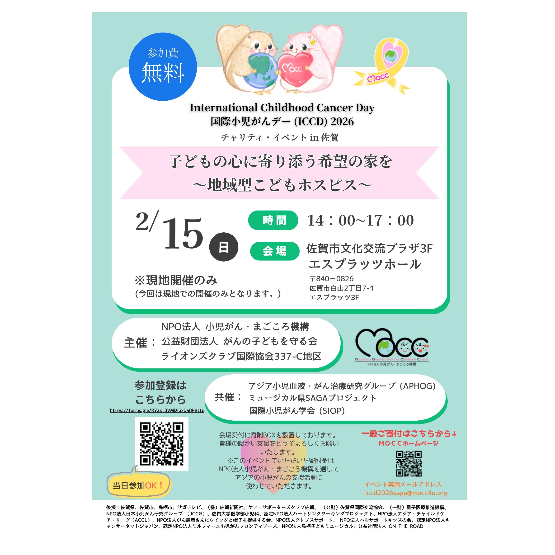 今回、NPO法人 小児がん・まごころ機構、公益財団法人 がんの子どもを守る会及びライオンズクラブ国際協会337-C地区では、「『国際小児がんデー(ICCD)』チャリティイベントin 佐賀」を開催されます。